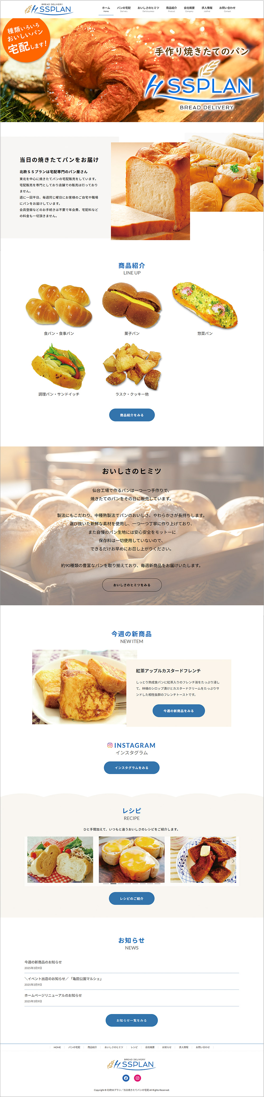 パンが主役になるシンプルでさわやかなサイト。背景の白色を活かし、アクセントに青色を使いました。